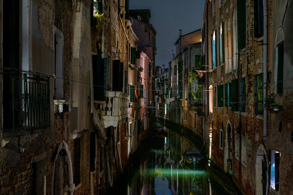 Nachts wird Venedig durch die künstliche Beleuchtung zu einem Bühnenbild des permanenten Untergangs.